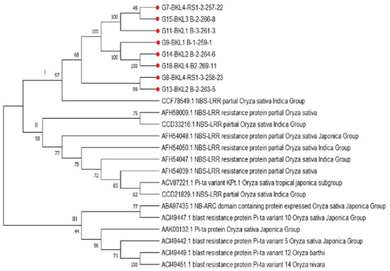 The expected value (E-value) is a statistically computed probability value describing the sequence similarity of rice lines acquired from Gene Bank (www.ncbi.nlm.nih.gov) (accessed on 23 January 2022). Phylogenetic analysis using the neighbor-joining method revealed that the detected rice lines carrying the Pita2 gene formed the same three groups. Figure 7 demonstrates that there were three large clusters, including cluster I, showing 97% similarity in the CCF78549.1 (NBS-LRR, partial [O. sativa Indica Group]) assessment, with E-value 2E-123. Cluster II has 98% similarity with the accession groups AFH58009.1, CCD33216.1, AFH54048.1, AFH54050.1, AFH54047.1, AFH54039.1, ACV87221.1, and CCD21829.1, while cluster III has similarity of 44% with the accession groups ABA97435.1, ACI49447.1, AAK00132.1, ACI49442.1, ACI49449, and ACI49451.1. BLAST investigation of the amino-acid-coding gene for the NB-ARC domain-containing protein revealed significant results.