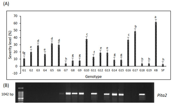 (A) The severity level of blast disease in the field in 19 genotypes, with Kencana Bali as a sensitive and Situ Patenggang as a resistant control. Different letters indicate statistically significant differences at p = 0.05 by LSD test; (B) the expression of the Pita2 gene in the G7, G8, G9, G11, G13, G14, G15, and G18 lines amplified at 1042 bp showed the consistency of blast resistance in the field.