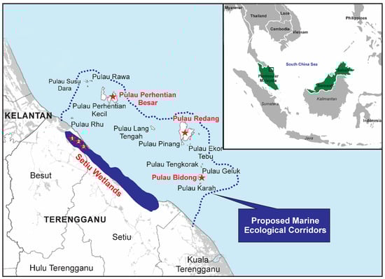 The forest cover of Terengganu on the east coast of Peninsular Malaysia is still relatively extensive, with ca. 654,000 ha of forested areas []. Within these areas, 30,000 ha have been gazetted as a state park in Kenyir and ca. 1600 ha in Setiu Wetlands, including the freshwater wetland of Tasik Berombak [,]. National or state parks are thus far considered the best protected areas that do not allow logging or monoculture plantations. On the other hand, ca. 544,000 ha have been gazetted as Permanent Reserved Forests, which are still partly subjected to state forest management for timber production []. There are 45 forest reserves in Terengganu, consisting mainly of dipterocarp forests. Among these are Besul, Bukit Bauk, Bukit Kesing, Bukit Terendak, Cerul, Gunung Tebu, Hulu Besut, Hulu Telemong, Hulu Terengganu, Jengai, Jerangau, Merchang, Pasir Raja Barat and Selatan, Pelagat, Petuang, Rasau Kerteh, Sungai Nipah, and Tembat, each with above 5000 ha []. Furthermore, there are 13 marine parks in Terengganu with 36 sea turtle nesting grounds, the largest amount in Peninsular Malaysia []. Thus, Terengganu’s islands and the long coastline in Setiu Wetlands have been proposed as important marine ecological corridors: the Northern Terengganu Marine Park Islands-Setiu Wetlands Ecological Corridor of Peninsular Malaysia (Figure 1).