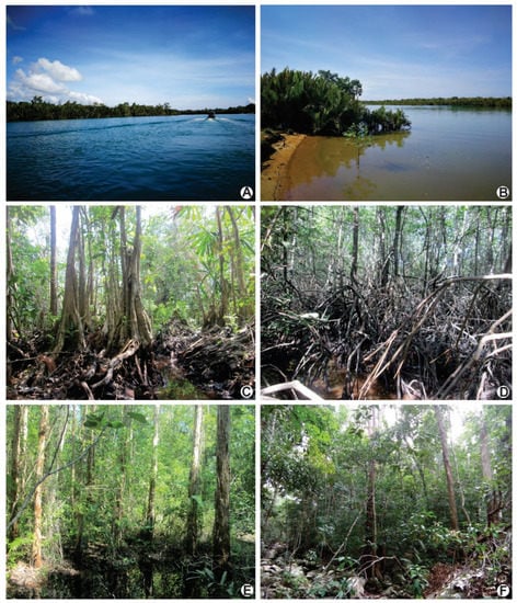 Different habitats at the study areas. (A,B) Setiu River, one of the four main rivers in Setiu Wetlands; (C) freshwater swamp forest; (D) mangrove forest; (E) Melaleuca swamp forest, (F) lowland dipterocarp forest in Pulau Redang.
