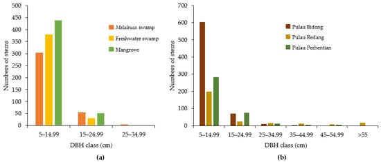 Diameter class distribution. (a) The Melaleuca swamp, freshwater swamp and mangrove forests in Setiu Wetlands; (b) the three major islands of Terengganu, Pulau Bidong, Pulau Redang, and Pulau Perhentian.