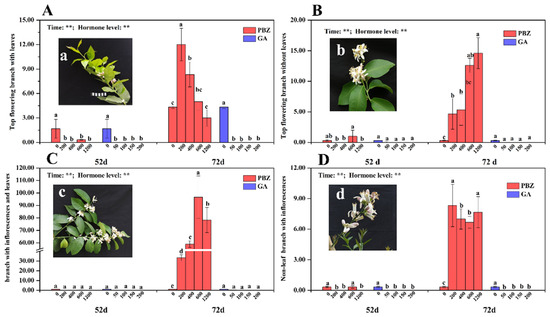 Effects of hormone regulation on the types and number of lemon flower branches: top flowering branch with leaves (A), top flowering branch without leaves (B), branch with inflorescences and leaves (C), and non-leaf branch with inflorescences (D).Different letters (a, b, c and d) denote significant differences based on a p value < 0.05. ** denotes extremely significant difference (p < 0.01).