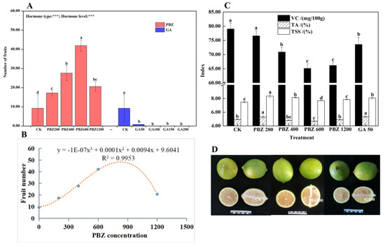 Effects of hormone regulation on fruit load and quality of lemons. (A) Effects of hormone regulation on number of fruits; (B) PBZ concentration–fruit number curves fit to pooled data calculated by an equation; (C) effects of hormone regulation on TSS, TA, and VC contents; (D) fruit morphologies under different treatments. Different letters (a, b, c and d) denote significant differences based on a p value < 0.05. *** denotes extremely significant difference (p < 0.001).
