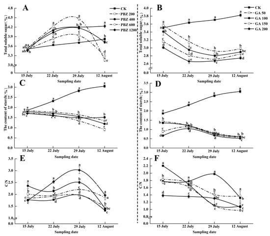 Effects of hormone regulation on total soluble sugar (A,B), and the starch contents (C,D), and C/N ratio (E,F) of lemon leaves. The left-hand plants were treated with paclobutrazol, and the right-hand plants were treated with gibberellin. Different letters (a, b, c and d) denote significant differences based on a p value < 0.05.