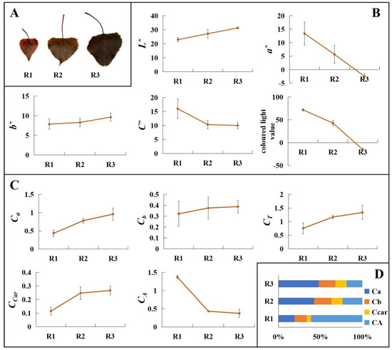Leaves’ physiological characteristics. (A) ‘Zhonghong’ poplar leaves; (B) Leaf color difference values of ‘Zhonghong’ poplar leaves; (C) content of photosynthetic pigments in ‘Zhonghong’ poplar leaves; (D) percentage content of each pigment in the leaves.