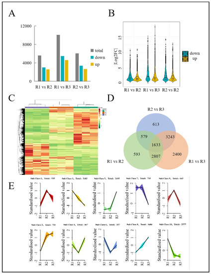 DeSeq2 was used to analyze the genes differentially expressed in the leaves of ‘Zhonghong’ poplar at different times; a total of 11,868 DEGs were identified. The statistics and distribution of the DEGs in each group are shown in Figure 2A,B. With respect to the three periods of leaf color change, we identified fewer DEGs in the R1 vs. R2 comparison group (5612) than in the R2 vs. R3 comparison group (6068), indicating that with the development of the leaves, the number of DEGs involved in color regulation increased, and the related process of gene regulation became more complex. The expression level of most DEGs gradually decreased, which suggests that the biological response involved in the leaf color transformation process was mainly driven by the downregulation of genes. In addition, a heatmap was constructed to visualize the overall picture of all DEG expression patterns, to better understand the overall variation in DEG expression (Figure 2C). The expression patterns of some DEGs were consistent with the transition period, and most DEGs showed great differences in terms of their expression profiles between R1 and R3. Further analysis showed that 1633 DEGs were commonly identified in all three sets of comparative analyses (Figure 2D). To study the expression patterns of genes differentially expressed in different periods, the FPKM of the genes was centralized and standardized, and a total of 10 expression patterns were obtained by k-means cluster analysis. The results suggested that a group of genes with similar changes in their expression could have similar functions (Figure 2E).