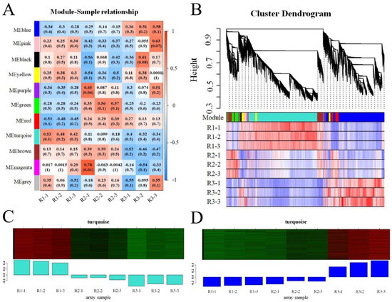 Weighted gene co-expression network analysis (WGCNA) of DEGs identified in ‘Zhonghong’ poplar leaves. (A) Relationships between modules and different samples, including petals. Each row in the table corresponds to a module, and each column corresponds to a sample; (B) gene dendrogram obtained by hierarchical clustering with the module color indicated by the color of the row underneath. A total of 11 distinct modules were identified; (C) Eigengene expression profile for the turquoise module in different tissues. The Y-axis indicates the module eigengene value; the X-axis indicates the samples; (D) Eigengene expression profile for the blue module in different tissues.