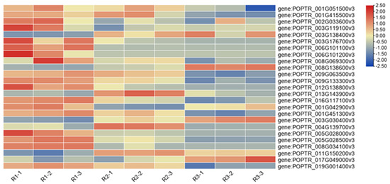 Factors that affect leaf color formation mainly include structural genes and regulatory genes. Based on the functional classification and enrichment analysis results of the DEGs via the GO, KEGG, and KOG databases, 24 differentially expressed structural genes associated with flavonoid metabolic pathways, anthocyanin biosynthesis, and phenylpropane biosynthesis were identified. Each gene had multiple transcripts, and those that were differentially expressed in the R1 vs. R2, R1 vs. R3, R2 vs. R3 comparisons as well as those that were downregulated included dihydroflavonol 4-reductase (DFR), BZ1, HCT, and FLS. In addition, the gene POPTR_008G138600v3 (DFR) was upregulated in all three comparisons, and the expression of multiple transcripts of the POPTR_009G133300v3 (BZ1) and ANS, CHS, and 3AT genes decreased during the three periods, which is consistent with the leaf color changes (Figure 4).