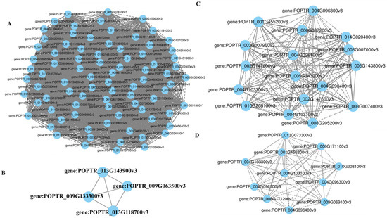 The correlation network of DEGs involved in flavonoid biosynthesis (ko00941), anthocyanin biosynthesis (ko00942), isoflavone biosynthesis (ko00943), and biosynthesis of flavonoids and flavonols (ko00944) is shown in Figure 5. There was a positive correlation between anthocyanin 3-O-glycoside 6′′-O-POPTR_009G063500v3 and three anthocyanin 3-O-glucosyltransferases (BZ1:POPTR_009G133300v3, POPTR_013G118700v3, POPTR_013G143900v3) in the anthocyanin biosynthesis regulatory network. In the flavonoid biosynthesis pathway, a complex regulatory relationship involving CYP73A, caffeoyl-coenzyme A O-methyltransferase, CHS, CHI, ANS, FLS, CYP75B1, ANR, HCT, LAR, DFR, CYP75A, codeine 3-O-demethylase, and salicylic acid 3-hydroxylase appeared.