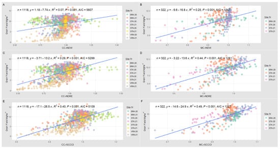 Grain yield vs. relative VI comparison when collected using Crop Circle and MicaSense sensors. Crop Circle relative VIs included NDVI (A), NDRE (C), and SCCCI (E), whereas MicaSense relative VIs included NDVI (B), NDRE (D), and SCCCI (F). The number of datapoints for each equation is represented by n, the equation is represented by y, the coefficient of determination is represented by R2, the p-value by P, and the Akaike Information Criterion by AIC.