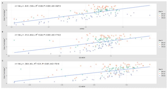 Sensor comparison between the relative VI values for the SPAD (A), GreenSeeker (B), and Crop Circle sensors (C) at the VT stage. The population for each equation is represented by n, the equation is represented by y, the coefficient of determination is represented by R2, the p-value by P, and the Akaike Information Criterion by AIC.