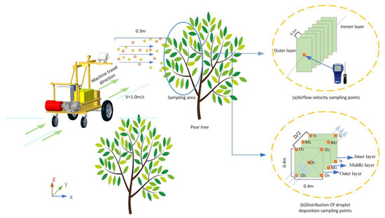 This study used pear trees (variety: Crown) as the model species, and aimed to achieve the following: (1) to measure the distribution of inner canopy airflow velocity under different conditions to clarify the change in attenuation of airflow at different positions in the canopy; (2) to compare and analyse droplet deposition and coverage with different ICAEVs, to determine a suitable ICAEV for pear trees, and to verify this by conducting a field trial. The purpose of this study is to identify suitable ICAEVs for fruit trees specifically for air-assisted plant protection, and to provide a new reference for air-assisted spraying research in orchards.
