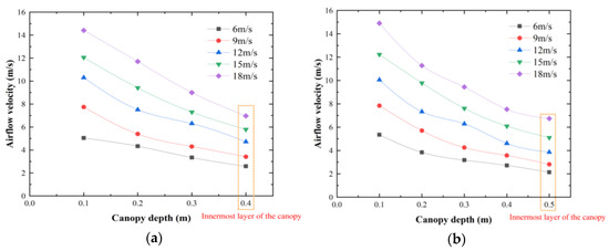 The impact of airflow velocity on actual application is limited, and the search for reasonable airflow velocity is a major concern when designing sprayers [31,32,33,34]. Researchers have two main objectives when designing plant protection air-assisted spraying systems: (1) to design different air-assisted sprayer systems based on various canopy structures to achieve full coverage and less drift of the aerosol stream, for example, adopting stacked fans [35] and adjusting the wind baffle [36] or the angle of the airflow outlet [8] to achieve the rationalisation of air and mist flow field distribution; (2) adjusting the airflow velocity in order to achieve high penetration of air and spray based on differing canopy biomasses. Air velocity is generally regulated by adjusting the area of the air outlet and inlet [37,38] or the fan speed [39,40]. Reasonable air velocity is often verified by measuring droplet deposition coverage. The airflow velocity value of interest is usually the outlet airflow velocity or the airflow velocity reaching the edge of the canopy [41,42,43]. The canopy, as an operational target, is also an important factor in airflow attenuation. It is not always clear which air velocity is needed to reach the inner layer of the canopy.