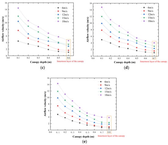 Variation in airflow attenuation within the canopy of pear trees of different crown diameters. (a) Crown diameter 0.8 m. (b) Crown diameter 1.0 m. (c) Crown diameter 1.2 m. (d) Crown diameter 1.4 m. (e) Crown diameter 1.6 m.