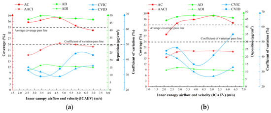 Of all the evaluation indices, the higher the AC, AACI, AD, and ADI, the better the application. Conversely, the lower the CVIC and CVID, the better the application. Combined with the requirements in the “Operational quality of air-assisted orchard sprayers (NY/T992-2006)” airflow delivery standard [27]—(1) CVID ≤ 50, (2) the adhesion rate of the pesticide on the crop is at least 33%—the suitable ICAEV is 2.70–3.18 m/s, as shown in Figure 8.