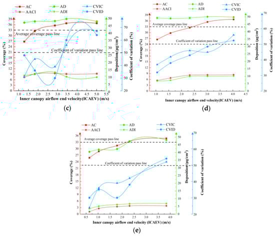 Comparing the AC curve with the AD curve reveals that the variation in the ICAEV had a greater influence on coverage than deposition. In Figure 6a–e for different crown diameters, the overall AD varied between 5 and 8 μg/cm2, and the overall AC varied between 7 and 12%. Considering that the actual average inner AD and AC varied above and below the benchmarks of 46 μg/cm2 and 33%, respectively, we concluded that the actual effect of ICAEV variation on coverage was significantly greater than that on deposition.