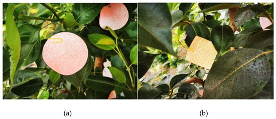 Detection of spray droplet coverage and deposition in the inner canopy. (a) Filter paper to detect droplet. (b) Cardboard to detect coverage.