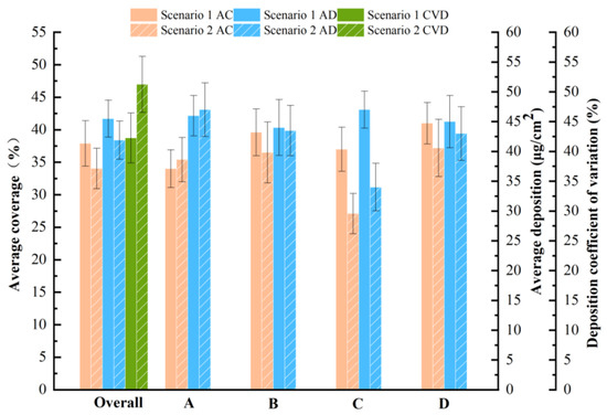The corresponding outlet airflow velocities for each layer in Scenario 1 were 7.88, 11.07, 16.54, and 13.67 m/s, respectively; the same outlet airflow velocity (12.29 m/s) was used for Scenario 2. Figure 9 shows that the overall AC of droplets in Scenarios 1 and 2 were 37.91 and 34.05%, respectively; the AD values were 45.5 and 41.88 μg/cm2, respectively. However, these values were not significantly different. Further, the AC and AD of the C layer in Scenario 1 were significantly higher than those in Scenario 2, mainly due to the larger outlet airflow velocity corresponding to C layers of the crown diameter, and the ICAEV at this velocity condition is suitable. In contrast, the airflow velocity at each outlet in Scenario 2 was uniform, and the ICAEV in the layer with a larger crown diameter might not achieve the effect in Scenario 1. Overall, the spatial variation distribution of airflow formed by uniform airflow delivery application is of great significance in the case of irregular canopies. The coefficient of variation of deposition (CVD) also verified the significance of non-uniform airflow delivery application based on suitable ICAEV. The coefficients of variation for Scenarios 1 and 2 were 42.25 and 51.25%, respectively, because the spray deposition in the C layers with larger canopy diameters was significantly different in the two scenarios.