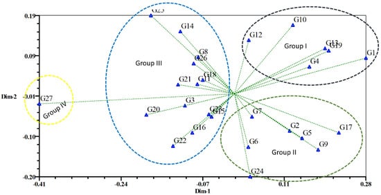 Principal component analysis showing the relationship among 27 chilli genotypes in a two-dimensional graph.