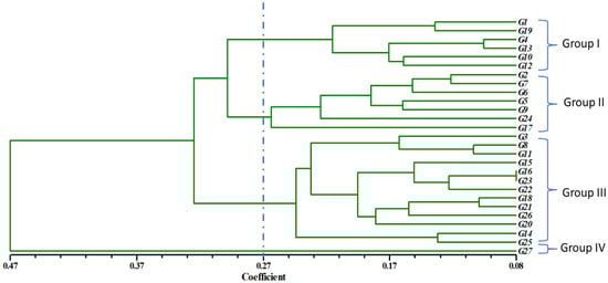 The 27 accessions were characterised morphologically and agronomically using a randomised complete block design, with four replicates consisting of two pot plants from each accession as the source of variance. One-way ANOVA was used to examine all of the data sets using SAS 9.4 statistical analysis software (North Carolina State University, Raleigh, NC, USA). The significance level was set at >0.05, and the LSD test was used to see if there were any significant differences between the means. A correlation coefficient was also determined. The dendrogram was mapped using SAHN clustering of the UPGMA method through the application of NTSYS 2.1 (Numerical Taxonomy Multivariate Analysis System, Exeter Software, Setauket, NY, USA) software. In addition, principal component analysis (PCA) was employed to generate 2Dvisualisations.