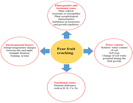 Fruit cracking has been studied in numerous fruit crops. However, the detailed physiology and mechanisms of this phenomena are poorly understood. Although research has been conducted emphasizing certain factors that intensify cracking, the complete prevention of cracking remains inconceivable. Several factors are responsible for the cracking of pear fruits; however, they have not been well characterized, and reports on the factors responsible for the management of cracking at the field level are limited. Identifying and manipulating the key factors responsible for cracking is necessary to avoid or reduce fruit cracking in pears. A well-managed orchard with cracking- and disease-resistant cultivars can reduce pear fruit cracking. A consistent growth pattern and high level of productivity can be achieved through the timely and appropriate provision of macro- and micronutrients. The application of plant growth regulators facilitates uniform growth and high yields. Genetics plays an important role in plant growth and development; further research into the genetic aspects of pear fruit cracking is required. Optimal orchard establishment, layout, cultural practices, and appropriate management can reduce these economic losses. Good orchard management, advanced production technologies, and only the best plant varieties must be used to ensure profitability. Finally, the application of nanoparticle-based fertilizers during the early stages of growth can help to prevent fruit cracking at later growth stages.