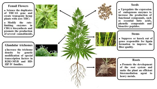As shown in Figure 1, CRISPR technology can help to release the full potential of Cannabis with traits improved. In response to the burgeoning market of medicine cannabinoids, research on Cannabis and cannabinoid biosynthesis have expanded significantly in recent ten years. The multiplex mutation system in CRISPR can be useful for cannabinoid metabolic engineering. For instance, the CRISPR/Cas9 technology can be applied to knock out the duplicates of THCAS gene, silence the THCAS gene via a single editing step, and even create transgenic Cannabis plants with zero THC. Increasing the accumulation of cannabinoids is another hot spot in the current study. It has been reported that upregulations of cannabinoid synthases (CBDAS and THCAS) would not promote cannabinoid biosynthesis, and the enzymatic steps for CBG production are critical for the biosynthesis of CBD and THC []. Gene editing allows breeders to modify the rate-limiting enzymes which participate in CBGA biosynthesis, such as GPP synthase, prenyltransferase, tetraketide synthase, or olivetolic acid cyclase. Besides, cannabinoids are synthesized and stored in the storage cavity of glandular trichomes, which can avoid the cytotoxicity of these metabolites []. Increasing trichome density is another feasible approach to enhance endogenous phytocannabinoid synthesis and storage capacity. By overexpressing the MYB1 gene from Artemisia annua, transgenic Cannabis displayed a higher average number of trichomes than the empty vector control []. As the homologous genes of AaMYB1, several MYB genes in hemp have been predicted to enhance trichome formation as well as CBDA synthesis [,]. Engineering these genes would result in overproduction or accumulation of cannabinoids above wild-type levels. Another widely used product of Cannabis is fiber, made from the plant stem. Suppression or knock out of genes responsible for lignin formation, such as the patatin-related phospholipase AIIIs, would affect Cannabis growth with less lignified stems and finally improve the fiber quality [].