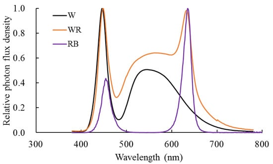 - Park, Y.; Runkle, E.S. Spectral effects of light-emitting diodes on plant growth, visual color quality, and photosynthetic photon efficacy: White versus blue plus red radiation. PLoS ONE 2018, 13, e0202386. [Google Scholar]