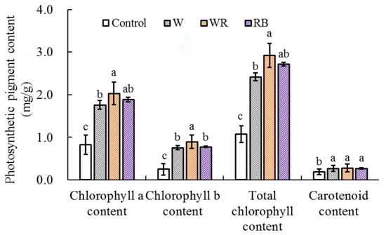 3.2. Effects of Supplementary White LEDs, White Plus Red LEDs, and Red Plus Blue LEDs on Photosynthesis and Photosynthetic Pigments of Tomato Seedlings