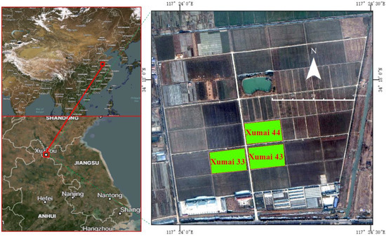 The experiments were conducted in a modern agricultural demonstration base in Xuzhou City, Jiangsu Province, China. As a large-scale, high-standard experimental field integrating scientific research and production, the base is rich in plant types to meet the needs of modern agricultural production (Figure 1). Rice–wheat rotation is a common farming method in Jiangsu Province, China, in which the crop rotation of the Xumai 44 and Xumai 43 fields was rice. Additionally, the crop rotation of the Xumai 33 field was sweet potato. The three winter wheat varieties are widely grown in northern Jiangsu. After the mechanized harvest of autumn grain crops, rice, sweet potato and soybeans are removed and winter wheat is planted, usually from October 15th until the start of November, at the demonstration base. The coldest months in this region are December and January (winter). These months offer favorable climatic conditions to winter wheat development, since winter wheat plants need vernalization, i.e., they need a period of low temperature before they can enter the reproductive growth phase from the vegetative growth phase (Figure 2). Xumai 44, Xumai 43 and Xumai 33 were sown on 21 October 2021, 20 October 2021 and 29 October 2021, respectively. The irrigation and fertilization management practices were the same for all studied fields. These cultivars reach the grain-filling period approximately 180 days after sowing (DAS).