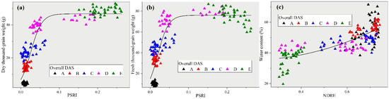 Overall models to monitor dry thousand-grain weight, fresh thousand-grain weight and water content using PSRI (a,b) and NDRE (c). A–E represent five sampling periods.