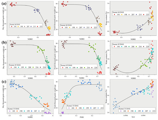 In the monitoring model of the overall data, the best performing VIs were mainly the NDRE and PSRI. When modeling different varieties, it could be found that the best VI for the three indicators of Xumai 44 and Xumai 43 was the NDRE, and the best VIs of Xumai 33 were the NDRE, NLI, NDVI and PSRI. In addition, during the screening process of functional models, it was found that the logistic growth model did not perform the best on all varieties and all indicators. The model of the overall data showed that the prediction accuracy of the logistic growth model was better than that of the linear and polynomial models in both dry and fresh thousand-grain weights, and was slightly worse than the polynomial model in terms of water content. In the separate modeling of the three varieties, it could be found that in terms of the monitoring of dry and fresh thousand-grain weight, all varieties performed the best on the logistic growth model. In the monitoring model of water content, except for Xumai 33, which performed slightly better on the logistic growth model, all other varieties performed the best on the polynomial model.