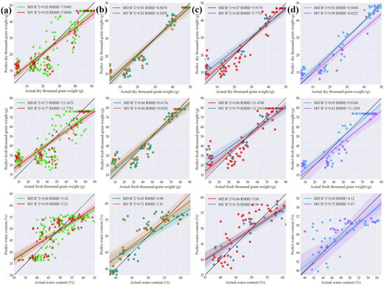 Reliability testing of the remote sensing monitoring model of three indicators of winter wheat in the grain-filling stage. (a) is the overall model, and (b–d) are the single-cultivar models of Xumai 44, Xumai 43 and Xumai 33, respectively.