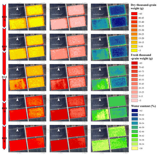 Considering that the models of the three varieties are quite different, and the performance of the overall model can also satisfy the accurate simulation of the grain-filling process of the three varieties of winter wheat, this study used the overall model to visualize the grain-filling process of winter wheat. The VIs have the potential to predict winter wheat maturity variability in commercial fields due to the strong correlation, high R2, and low RMSE values observed. Figure 8 shows the different time inversions of dry and fresh thousand-grain weight inputted into the logistic growth model with the PSRI as the independent variable, and shows water content inputted into the polynomial model with the NDRE as the independent variable.