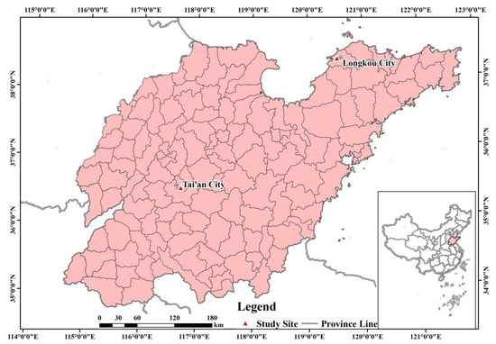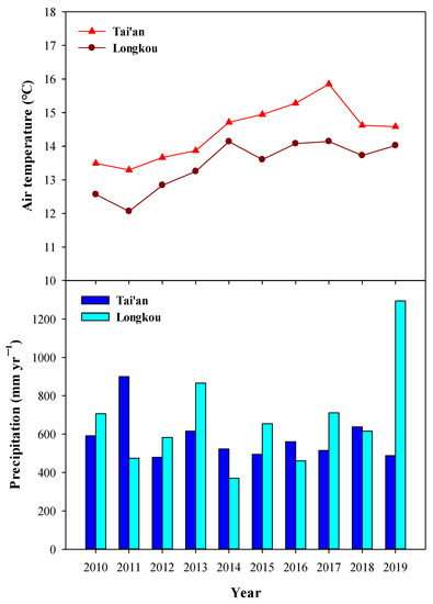 One warm-dry region (Tai’an) and one cool-wet (Longkou) region of Shandong Province in northern China were selected in this study (Figure 1). This former and the latter have a temperate continental monsoon climate, with mean temperatures of 14.4 °C and 13 °C and mean annual precipitation values of 580.6 mm and 650 mm, respectively, during 2010–2019 (Figure 2). The experiment was first established in Tai’an (36°09′ N, 117°09′ E) in 2002. Considering the climatic factors, another experiment with the same treatments was conducted in Longkou (37° 38′ 30″ N, 120° 24′ 9″ E) in 2006. The soils in the two regions were the same and were classified as Cambisols (Food and Agriculture Organization). Only the temperature and precipitation were different. The major initial (2002) properties in the 0–20 cm soil layer in Tai’an were: 40% sand, 44% silt, and 16% clay; the pH was 7.09, and the soil contained 7.2 g kg−1 soil organic carbon, 1.3 g kg−1 total nitrogen, 0.8 mg kg−1 available phosphorus, and 41.3 mg kg−1 exchangeable potassium. The major initial (2006) properties within the 0–20 cm soil depth in Longkou were: 47.0% sand, 37.0% silt, and 15.0% clay; the pH was 6.4, and the soil contained 7.6 g kg−1 soil organic carbon, 115.0 mg kg−1 total nitrogen, 36.7 mg kg−1 available phosphorus, and 91.2 mg kg−1 exchangeable potassium.