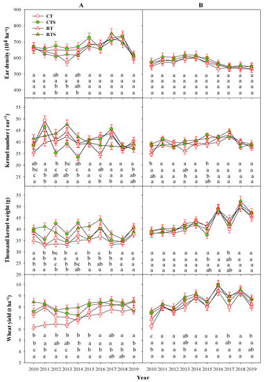 Wheat yield and yield components over time under tillage and straw returning practices at the Tai’an (A) and Longkou (B) experimental sites. CT: conventional tillage without straw returning; CTS: conventional tillage with straw returning; RT: rotary tillage without straw returning; RTS: rotary tillage with straw returning. T-like lines: standard deviation. Different letters in each column indicate significant differences between different treatments (p < 0.05; Duncan’s test).