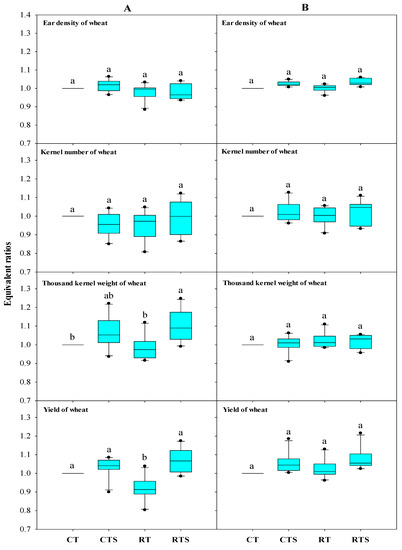 Box plots of equivalent ratios of the wheat yield and yield components under tillage and straw returning practices at the Tai’an (A) and Longkou (B) experimental sites. The horizontal line inside the boxes denotes the median value. The error bars show the upper/lower quartiles (1.5 interquartile distance). The line extending vertically from the box represents the variability beyond the range of the upper and lower quartiles, and the values represent the 10th and 90th percentiles, respectively; the points that lie outside of this range are shown as solid circles. CT: conventional tillage without straw returning; CTS: conventional tillage with straw returning; RT: rotary tillage without straw returning; RTS: rotary tillage with straw returning. Different letters in each group indicate significant differences between different treatments (p < 0.05; Duncan’s test).