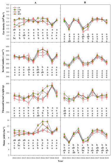 Maize yield and yield components over time under tillage and straw returning practices at the Tai’an (A) and Longkou (B) experimental sites. CT: conventional tillage without straw returning; CTS: conventional tillage with straw returning; RT: rotary tillage without straw returning; RTS: rotary tillage with straw returning. T-like lines: standard deviation. Different letters in each column indicate significant differences between different treatments (p < 0.05; Duncan’s test).