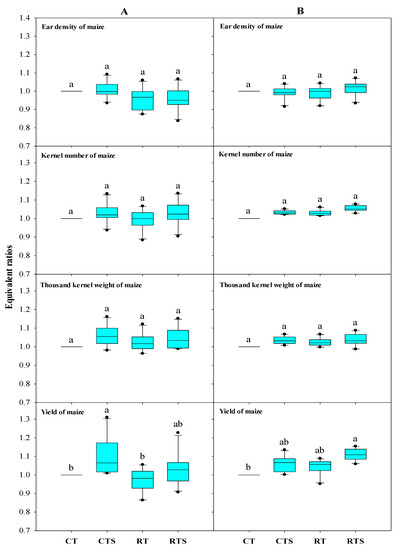 Box plots of equivalent ratios of the maize yield and yield components under tillage and straw returning practices at the Tai’an (A) and Longkou (B) experimental sites. The horizontal line inside the boxes denotes the median value. The error bars show the upper/lower quartiles (1.5 interquartile distance). The line extending vertically from the box represents the variability beyond the range of the upper and lower quartiles, and the values represent the 10th and 90th percentiles, respectively; the points that lie outside of this range are shown as solid circles. CT: conventional tillage without straw returning; CTS: conventional tillage with straw returning; RT: rotary tillage without straw returning; RTS: rotary tillage with straw returning. Different letters in each group indicate significant differences between different treatments (p < 0.05; Duncan’s test).
