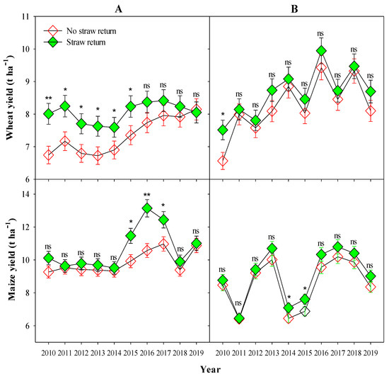 Wheat and maize yields over time under no straw return and straw return practices at the Tai’an (A) and Longkou (B) experimental sites. ** significant difference at 0.01 level; * significant difference at 0.05 level; ns: not significant difference.
