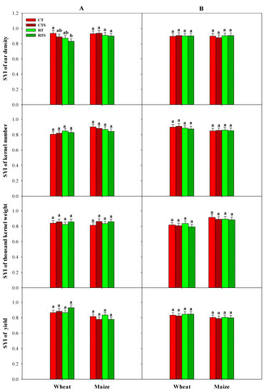 Yield and yield component stability of wheat and maize under tillage and straw returning practices at the Tai’an (A) and Longkou (B) experimental sites. CT: conventional tillage without straw returning; CTS: conventional tillage with straw returning; RT: rotary tillage without straw returning; RTS: rotary tillage with straw returning. T-like lines: standard deviation. Different letters in each group indicate significant differences between different treatments (p < 0.05; Duncan’s test).