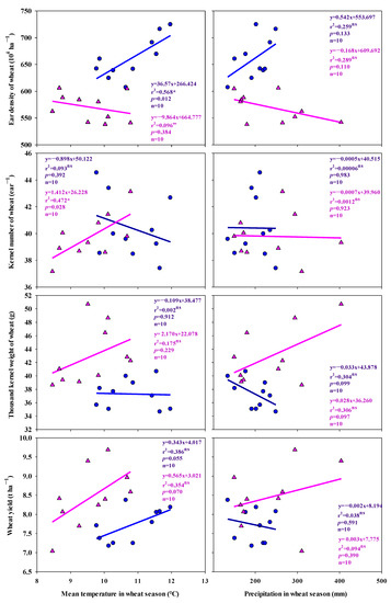 At the warm-dry site, there was a positive correlation between the ear density of wheat and the mean temperature in the wheat season at the 0.05 level (Figure 9). The difference between the wheat yield and mean temperature in the wheat season was nearly significant at the 0.05 level. The maize yield was positively correlated with the mean temperature in the maize season at the 0.01 level (Figure 10). At the cool-wet site, there was a positive correlation between the kernel number of wheat and the mean temperature in the wheat season at the 0.05 level (Figure 9). The difference between the wheat yield and mean temperature in the wheat season was nearly significant at the 0.05 level. The kernel number, thousand-kernel weight of maize, and maize yield were positively correlated with the mean temperature in the maize season at the 0.05 level (Figure 10). Other indices had no obvious divergence with mean temperature and precipitation.