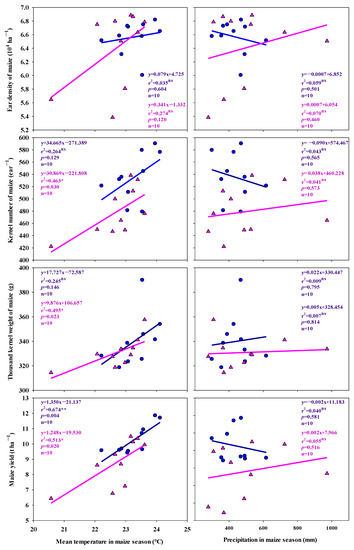 Correlation between maize yield, yield components and mean temperature and precipitation in the maize season. The blue circles, lines, and formulas represent the data of the Tai’an experimental site, and the pink circles and lines represent the data of the Longkou experimental site. r: correlation coefficient; p: significance level; n: sample size; **: significant at p < 0.01; *: significant at p < 0.05. ns: not significant.