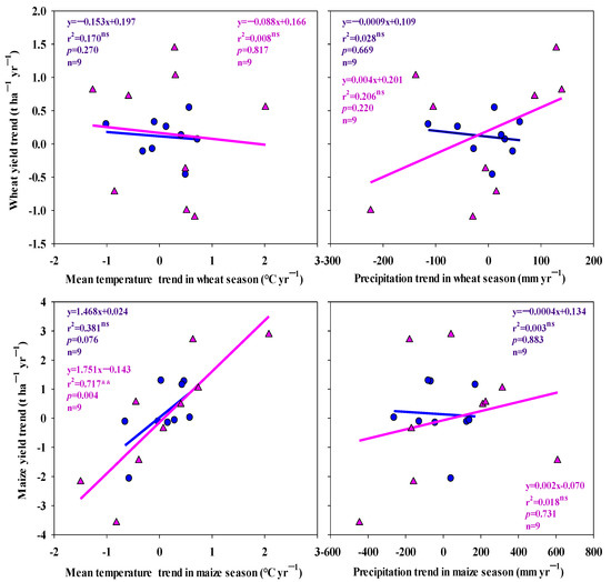 Correlation between wheat and maize yield and mean temperature trend and precipitation trend. The trend represents the difference of the following year minus the previous year. The blue circles and lines represent the data of the Tai’an experimental site, and the pink circles, lines, and formulas represent the data of the Longkou experimental site. r: correlation coefficient; p: significance level; n: sample size; **: significant at p < 0.01; ns: not significant.
