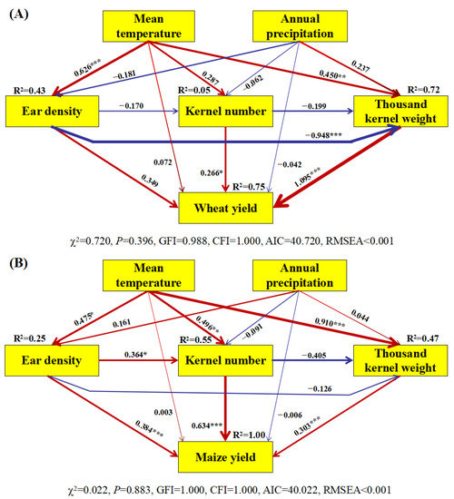 Structural equation modeling further revealed the direct and indirect effects of mean temperature, annual precipitation, and yield components on crop yield (Figure 12). The combination of mean temperature, annual precipitation, and yield components explained 75% and 100% of the variance in the wheat yield and maize yield, respectively. The mean temperature and annual precipitation had weak direct effects but stronger indirect effects on crop yield through their associations with yield components. The mean temperature had a significant positive correlation with the ear density and thousand-kernel weight of wheat and with the ear density, kernel number, and thousand-kernel weight of maize. The annual precipitation had no significant correlation with the yield components, which was inconsistent with our hypothesis. The ear density of wheat had a strong negative effect on thousand-kernel weight. The thousand-kernel weight played a major role in regulating wheat yield, and the kernel number played a major role in regulating maize yield.