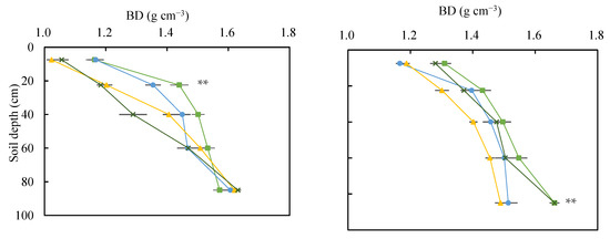 Profile distribution of soil bulk density (BD) and Ks at upper slope (UP), middle slope (MP), lower slope (LP), and footslope positions (FP) in sustainable cropland (left) and in conventional cropland (right). Ks: saturated hydraulic conductivity. The error bars are two standard errors of the means. ** indicates that the difference among different slope positions is significant at p < 0.05.