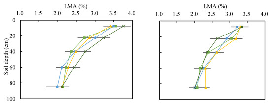 The composite soil samples were transported to the laboratory and air-dried. The air-dried composition samples were ground to pass through 8.0 mm, 2.0 mm, and 0.25 mm sieves to analyze the water-stable aggregates, particle composition, and the contents of OC, N, and P, respectively. Soil particle composition was measured using laser diffraction methods (Mastersizer 2000, Malvern Instruments, Malvern, UK). The OC contents were determined using the oil bath-K2Cr2O7 titration method of Walkley–Black [30]. Total N contents were measured using the Kjeldahl method [31]. Total P content was determined colorimetrically after wet digestion with sulfuric acid and perchloric acid [32]. A 200-g air-dried soil sample (<8.0 mm) was analyzed for water-stable aggregate distribution by an adopted wet sieving method [33]. The four aggregate classes, i.e., large macroaggregate (LMA, >2 mm), small macroaggregate (SMA, 0.25–2 mm), microaggregate (MI, 0.25–0.053 mm), and silt + clay fraction (SC, <0.053 mm), were separated. These measurement procedures for water-stable aggregate were described in detail by Li et al. [25] Although the method might overestimate the proportion of small size aggregates due to the excessive disturbance of this fraction, we reported results from this most commonly used method so that our results would be comparable with others [25,33].