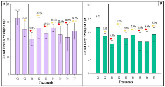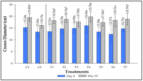 Specifically, the mean crown diameter of the treatments was compared on day 0 and day 15 with Duncan’s test (p ≤ 0.05). In addition, the crown diameters from days 0 and 15 were compared with a paired Student’s t-test (p ≤ 0.01). Furthermore, the variation in growth was compared with the overall crown diameter on day 0 using Dunnet’s test (p ≤ 0.05).