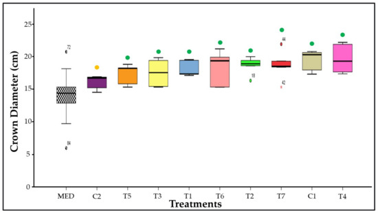 The mean crown diameter of the treatments was compared on day 0 and day 15. Furthermore, the variation in growth provided by each treatment was verified in relation to the initial value of the crown length between seedlings. The statistical methodology used to perform these comparisons is described in Section 2.8.