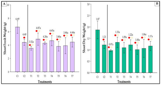 Statistical inferences were performed using RStudio [42] and IBM SPSS Statistics 20 software [43]. The normality and homogeneity of the residuals were checked for all variables. Nonparametric data were analyzed with the Kruskal–Wallis test (p ≤ 0.05) followed by Dunn’s test (p ≤ 0.05) for multiple comparisons. For parametric data, a one-way analysis of variance was performed, followed by the Dunnet test comparing inoculated treatments and controls (p ≤ 0.05). Lastly, Duncan’s test (p ≤ 0.05) was used as a multiple comparison test. The graphs were plotted using SigmaPlot 12.3 [44] and the RStudio software.