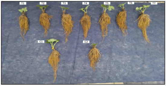 The inoculations, especially with B. fluminis (T3), increased root length significantly. Above all, auxins are responsible for root elongation. Consequently, the more extensive root surface enables the plant to better exploit the soil for nutrients [70]. Nevertheless, the length of the roots did not necessarily represent roots with a greater weight. This may be related to the plant’s strategy to explore the environment, especially when comparing treatments T3 and C2. In a way, the plants with better resource access grew more vertically and gained root length; these resources may be the hormones released by bacteria [71]. Conversely, when these resources are scarce, plants may prioritize horizontal growth, with greater prominence of primary and voluminous roots [72].